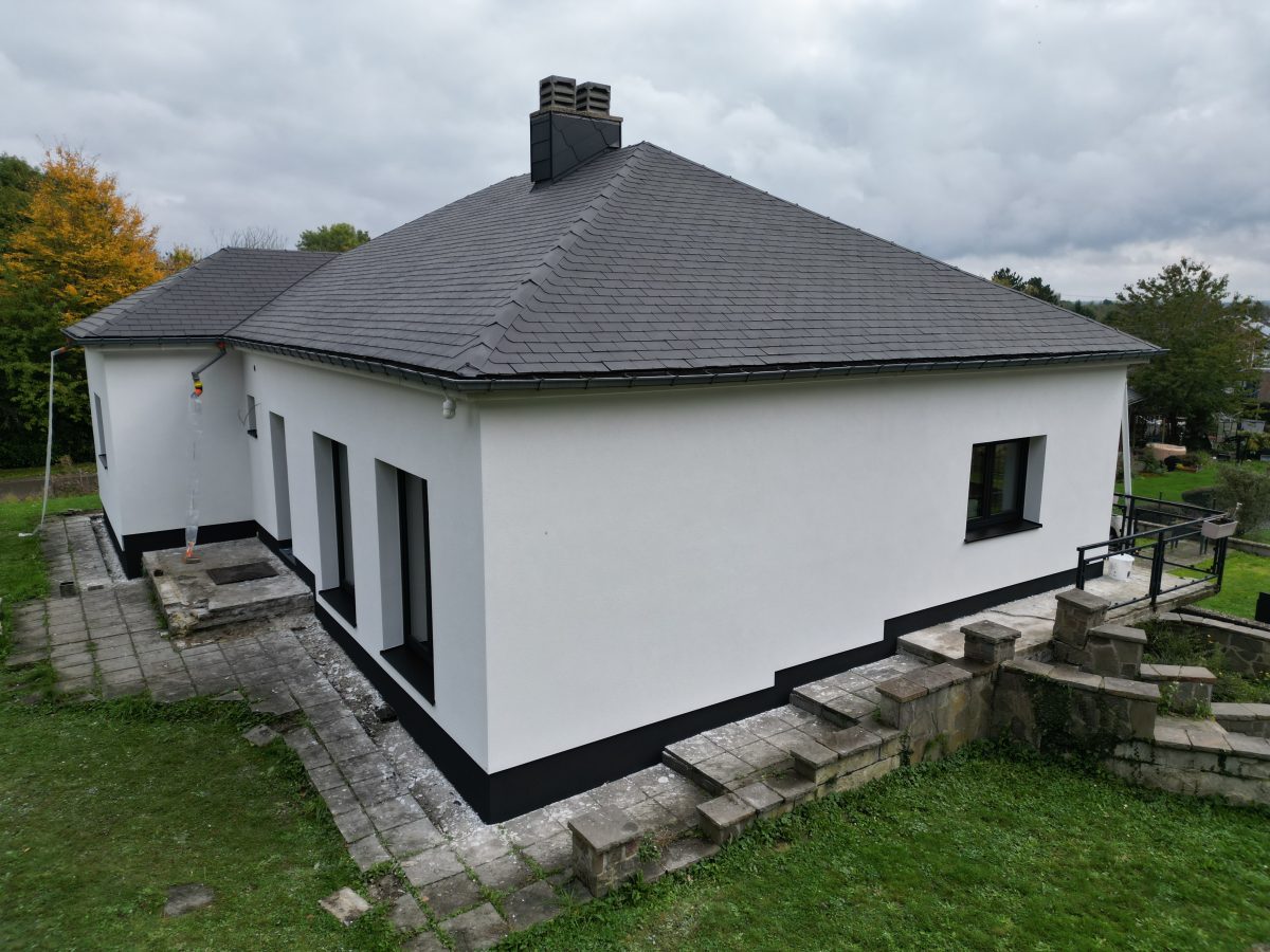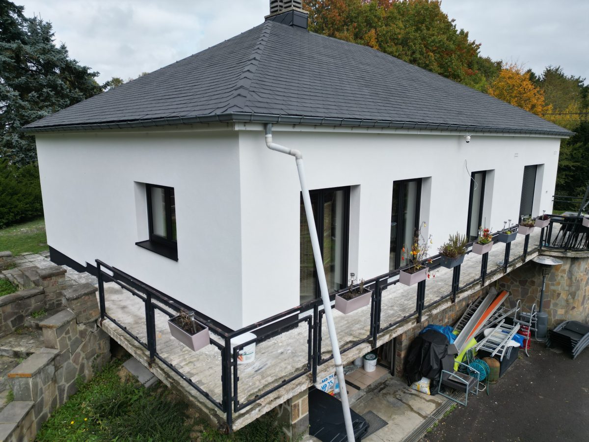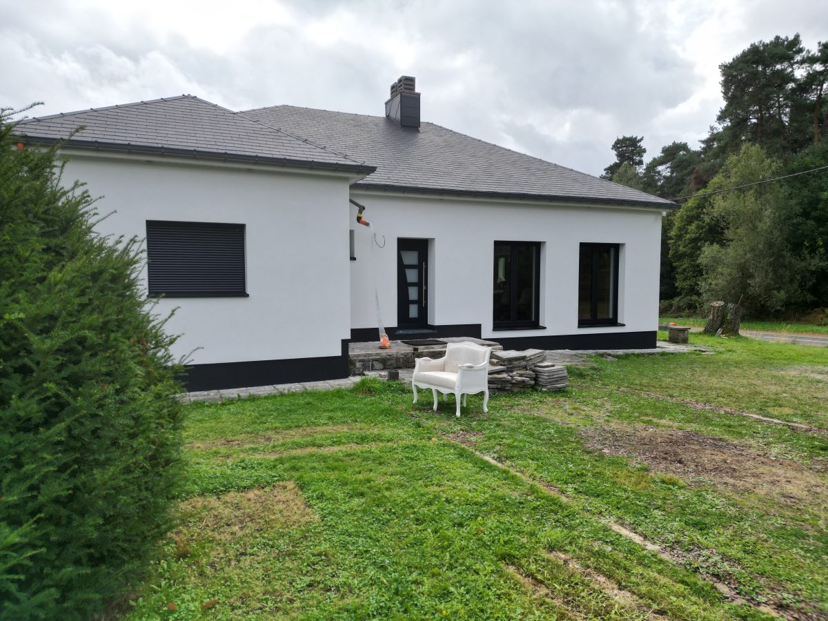 - Pose d’un crépi blanc, grain 1,5 mm
